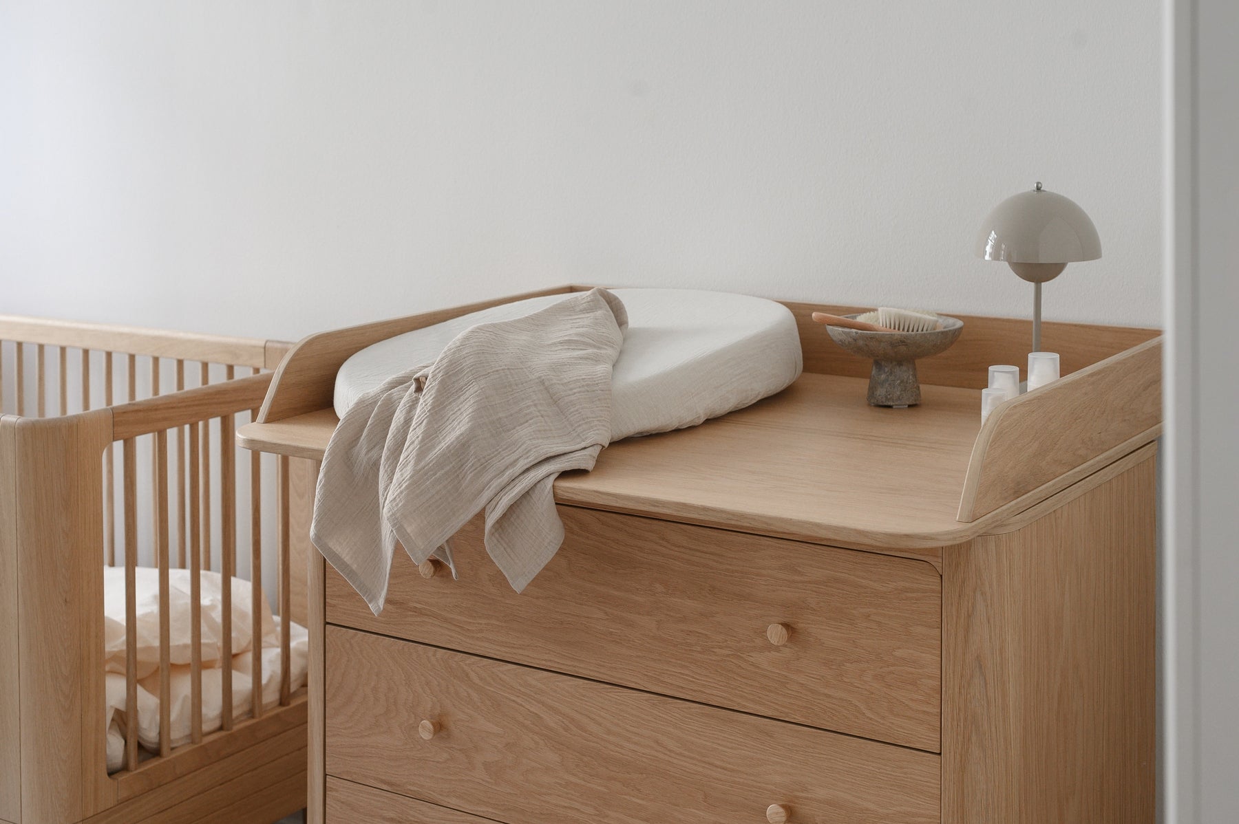 Verwandeln Sie Ihre We Are Bitte Nature 2.0 Kommode in eine ruhige, platzsparende Wickelstation. Aus hochwertiger, massiver Eiche mit warmer, zeitloser Oberfläche gefertigt, hält dieser sichere Aufsatz das Kinderzimmer organisiert und verwandelt den Windelwechsel in einen ruhigen, vertrauten Moment.