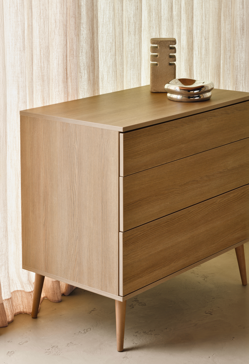 Atemporal y refinada, la cómoda Quax Flow aporta la cálida tonalidad Honey Ash y facilita la organización. Sus cajones sin tiradores, con sistema de apertura por presión (push-to-open), y su amplio espacio guardan con elegancia los artículos esenciales del bebé.