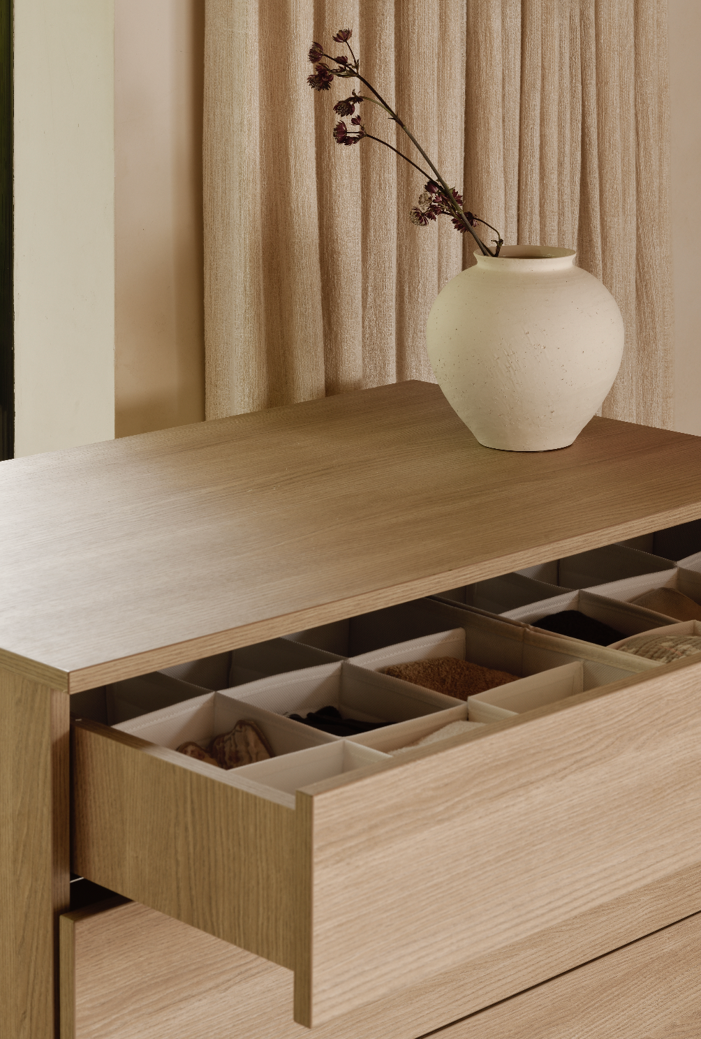 - Cajones sin tiradores con un discreto sistema de apertura por presión (push-to-open) para un acceso suave y sin complicaciones