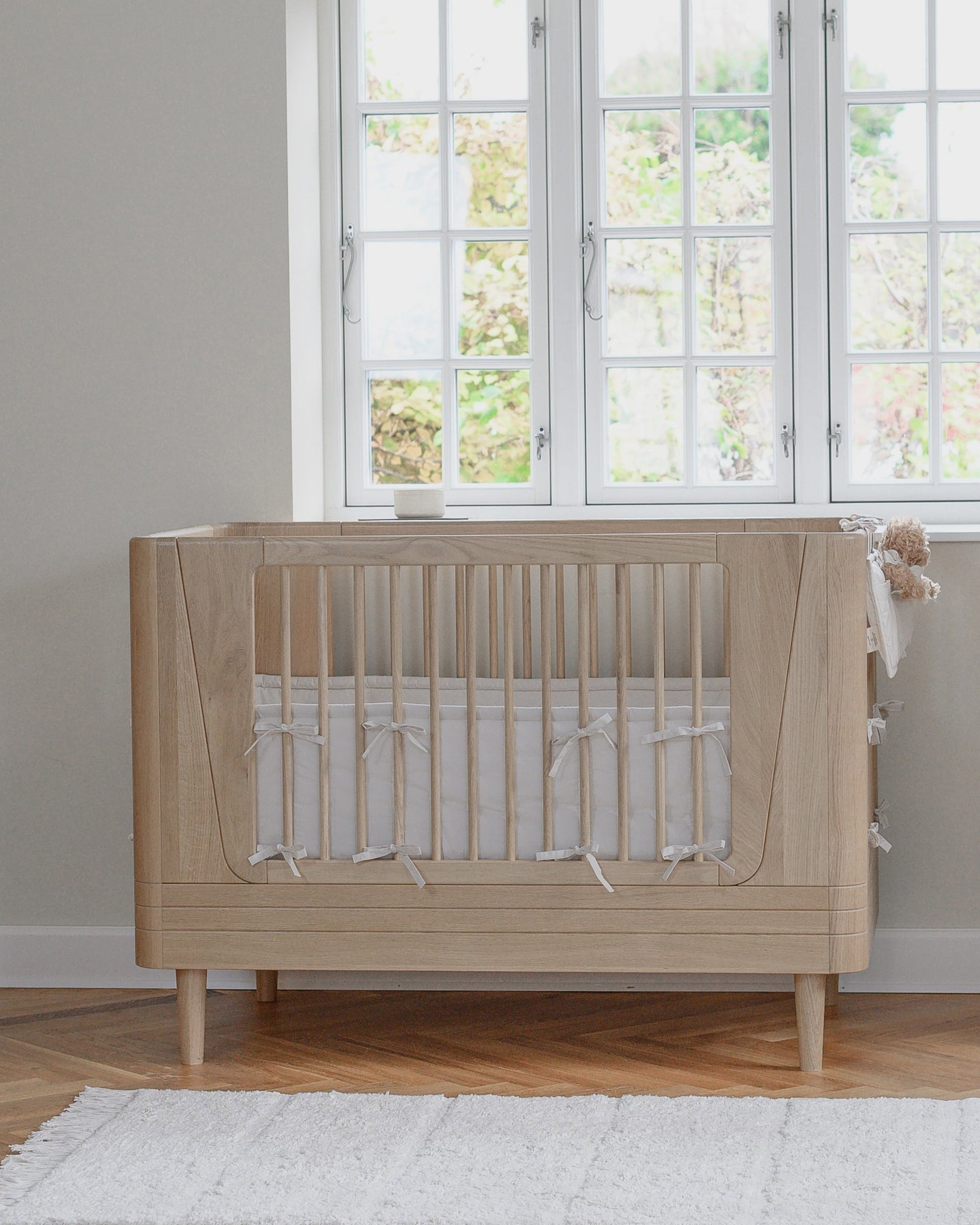 Un protector suave de algodón orgánico, confeccionado a medida para la Nature Baby Bed. Acolcha a los más pequeños y aporta un acabado acogedor y elegante al dormitorio del bebé.