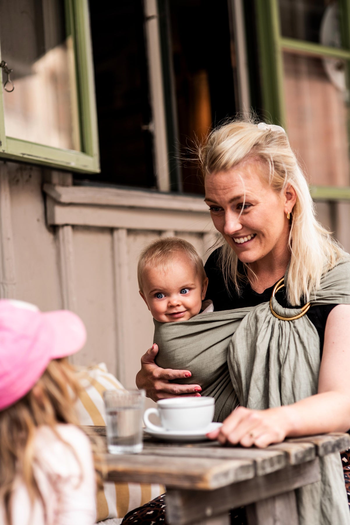 Beide vrouwen delen de overtuiging dat er geen betere manier is om je kleintje vast te houden dan hart tegen hart met ringslings — de stille helden van babydragen.