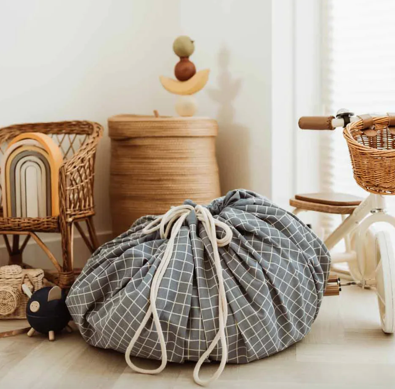 Maak opruimen moeiteloos met dit speelkleed van biologisch katoen dat binnen enkele seconden omgetoverd kan worden tot een stijlvolle opbergzak. De tijdloze 'Grid Blue'-print staat prachtig in elke ruimte, van babykamer tot speelkamer.