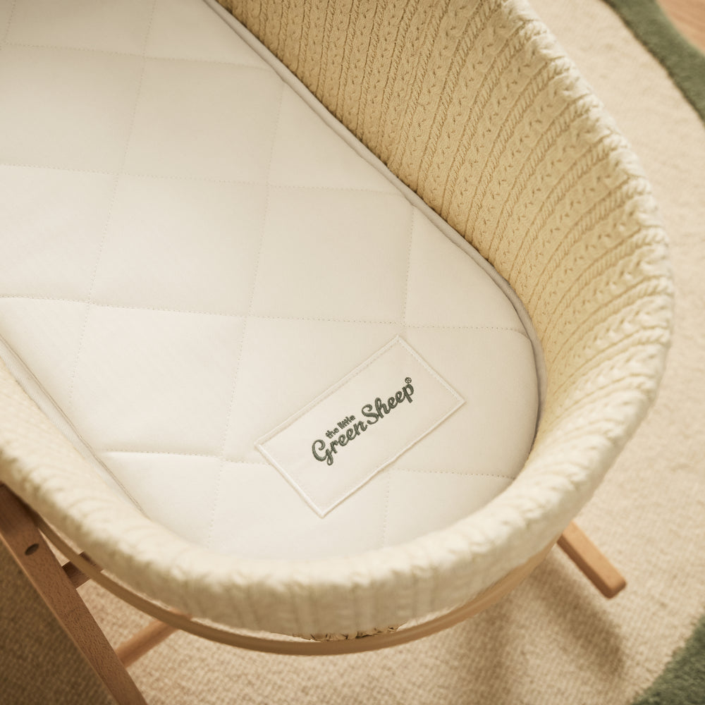 Geef je pasgeborene puur, ademend comfort met een handgemaakt Mosesmand-matras, gemaakt van katoen, kokoscoir, natuurlijk latex en wol — vrij van chemische sprays en ontworpen om je baby knus, comfortabel ondersteund en ontspannen te houden.