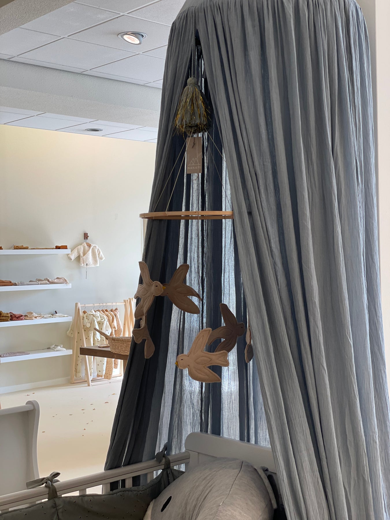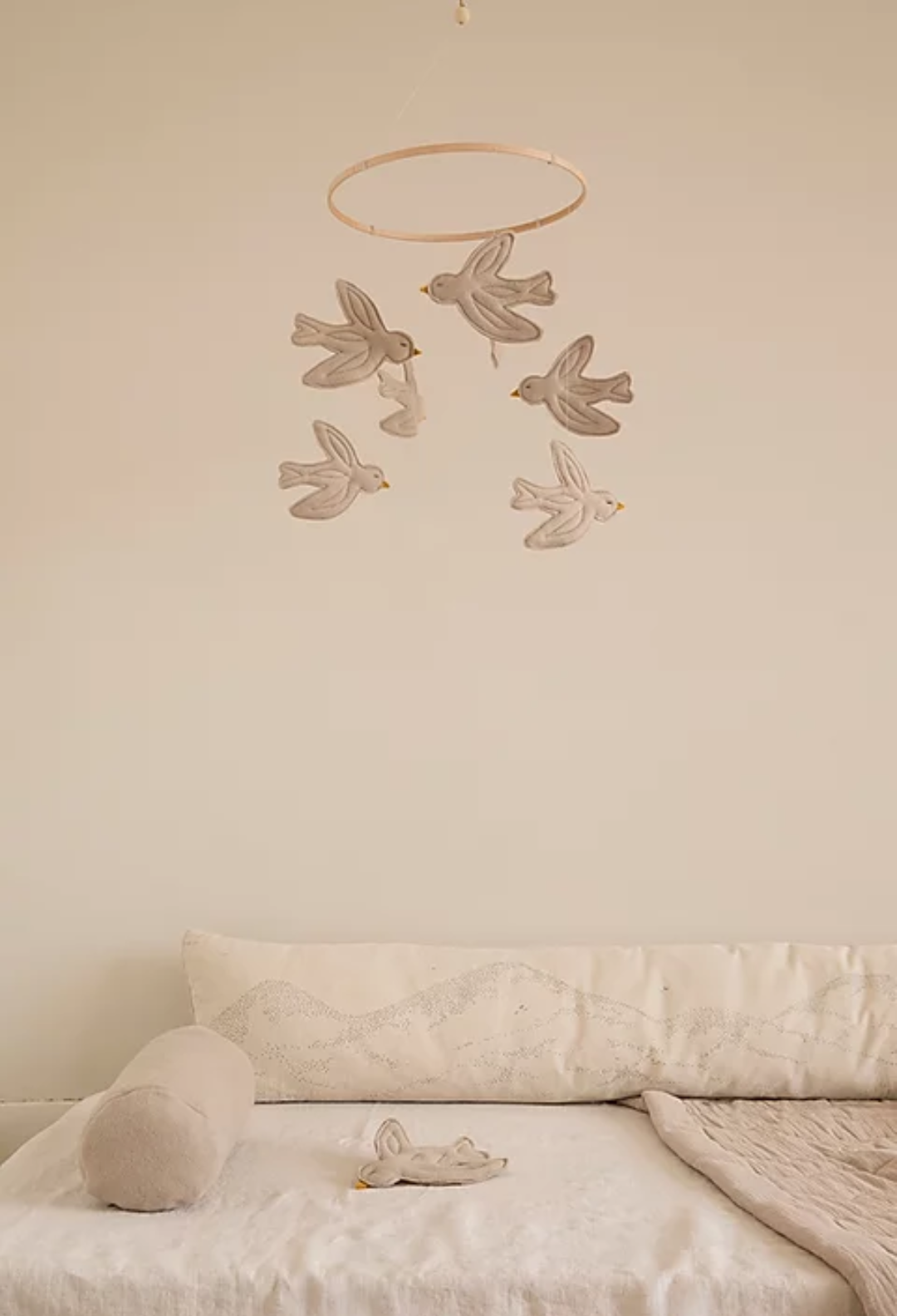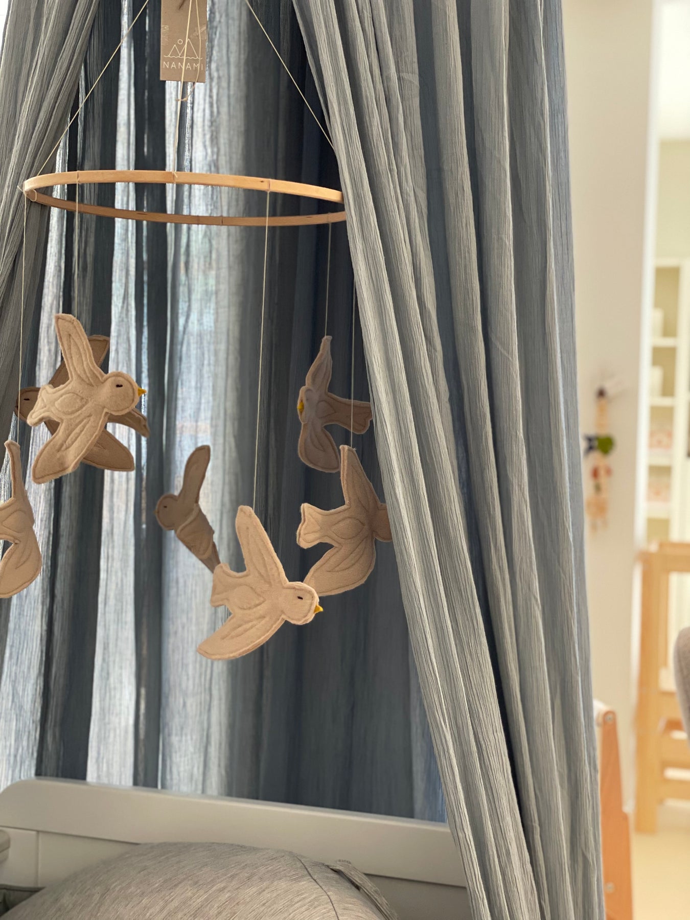 Skapa lugn, modern skönhet i barnrummet med Nanami Fågelmobilen - en minimalistisk mobil i bomull och trä som mjukt fängslar din lilla skatt och smälter samman perfekt med vilken inredning som helst.